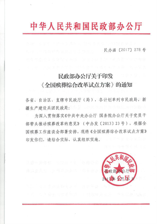 民政部辦公廳關(guān)于印發(fā)《全國(guó)殯葬綜合改革試點(diǎn)方案》的通知